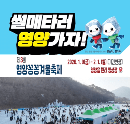 전국의 겨울 축제가 줄취소되는 가운데, 유일하게 2월 1일까지 일주일 연장 운영을 결정한 영양 꽁꽁겨울축제! 방문 전 꼭 알아야 할 핵심 정보만 깔끔하게 정리해 드립니다. ✨